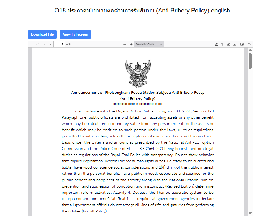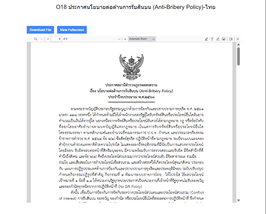 หัวหน้าสถานีอบรมเสริมสร้างคุณธรรม จริยธรรม สร้างจิตสำนึกและค่านิยมในการต่อต้านการทุจริตคอรัปชั่น ต่อต้านการรับสินบน ประกาศเจตจำนงสุจริตในการบริหารงาน (Anti Bribery Policy) และประกาศเจตนารมณ์ที่จะไม่รับของขวัญของกำนัลทุกชนิดจากการปฏิบัติหน้าที่ (No Gift Policy) และแนวทางการปฏิบัติตนของข้าราชการตำรวจตามประมวลจริยธรรมข้าราชการตำรวจ