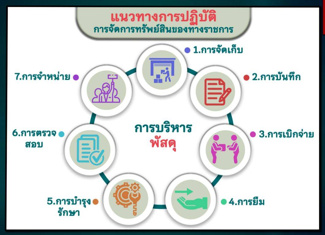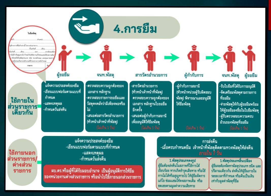 4. กำหนดแนวทางการยืมหรือเบิกจ่ายทรัพย์สินของราชการและของบริจาคไปใช้ปฏิบัติงานที่ชัดเจน