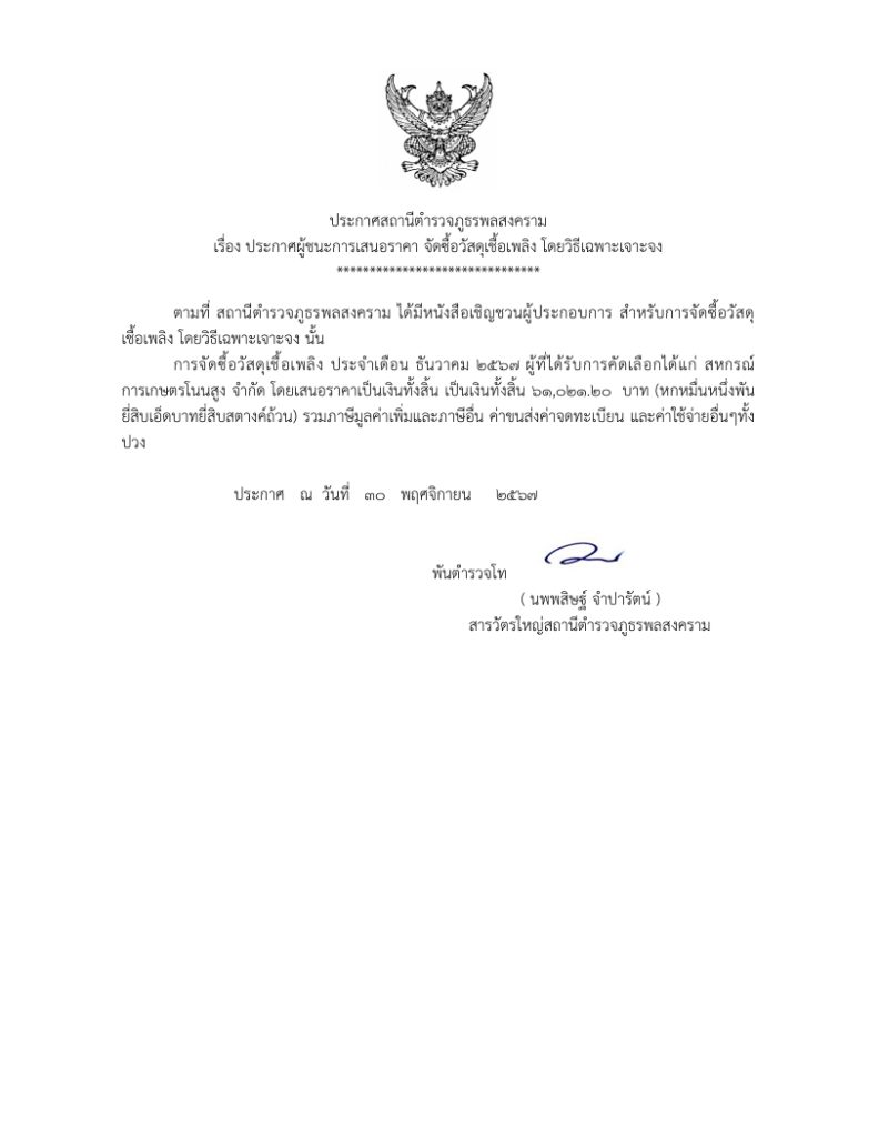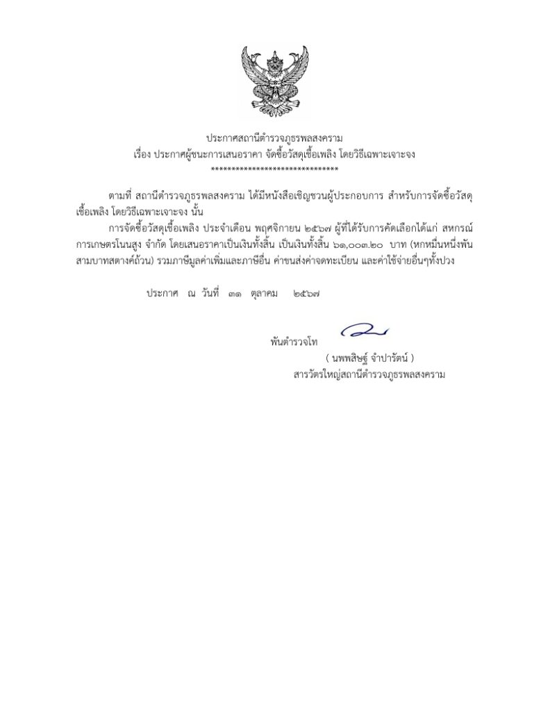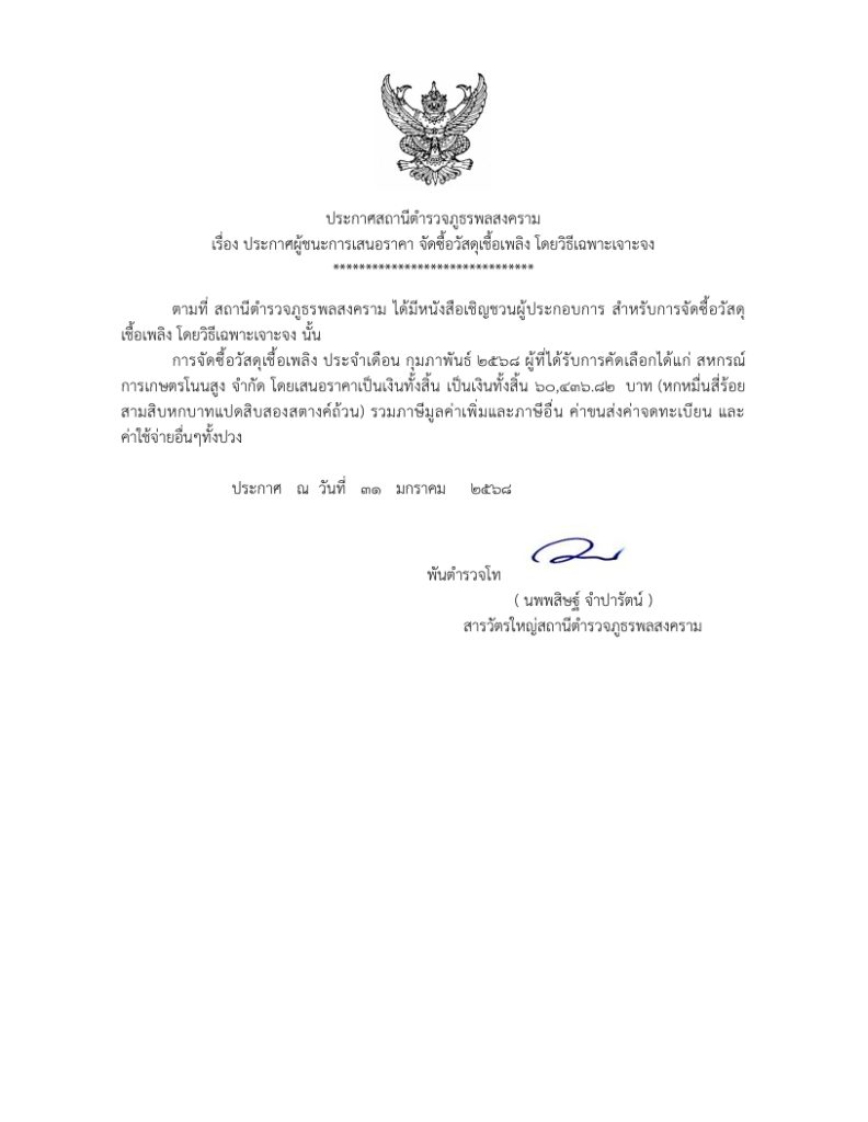 ประกาศต่าง ๆเกี่ยวกับการจัดซื้อจัดจ้าง ประจำปีงบประมาณ 2568 ของ สถานีตำรวจภูธรพลสงคราม